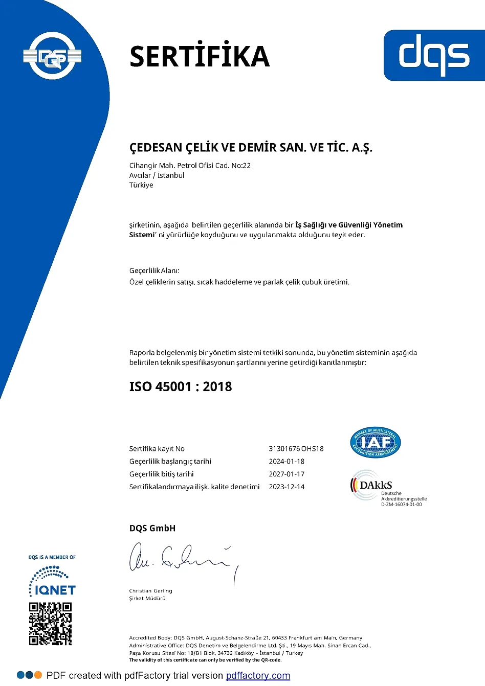 Katılımcı bir anlayışla yaralanmaların ve sağlık bozulmalarının önlenmesi ve İSG yönetiminin ve İSG performansının sürekli iyileştirilmesi için, yönetimin performansını değerlendirmek ve sistemi sürekli güncelleyerek; İSG performansında sürekli iyileşmeyi sağlamak.